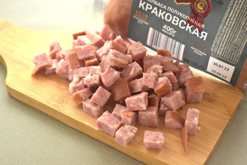 - Очищаем краковскую колбасу от шкурки. Нарезаем колбасу небольшими кубиками и переправляем их в миску.