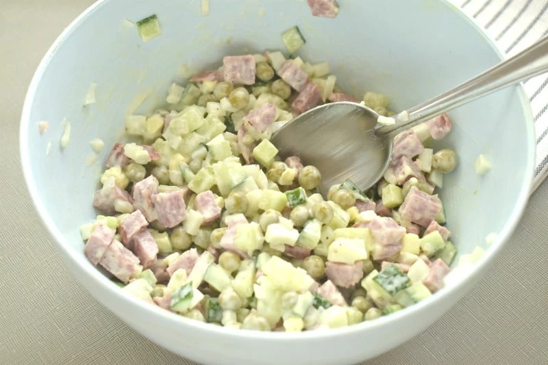 - Заправляем салат майонезом или сметаной, на свой вкус солим и перчим, а потом перемешиваем.