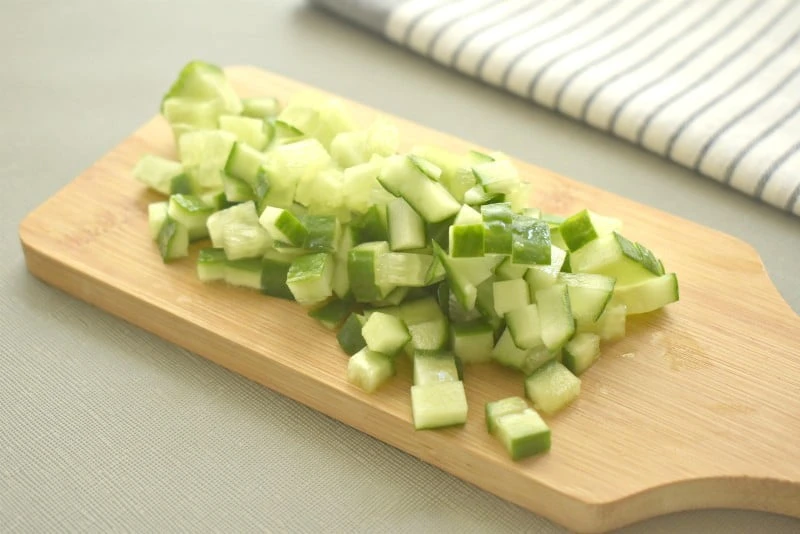 - Тщательно промываем свежий огурец, срезаем у плода кончики. Измельчаем огурец тоже кубиками и добавляем к колбасе.