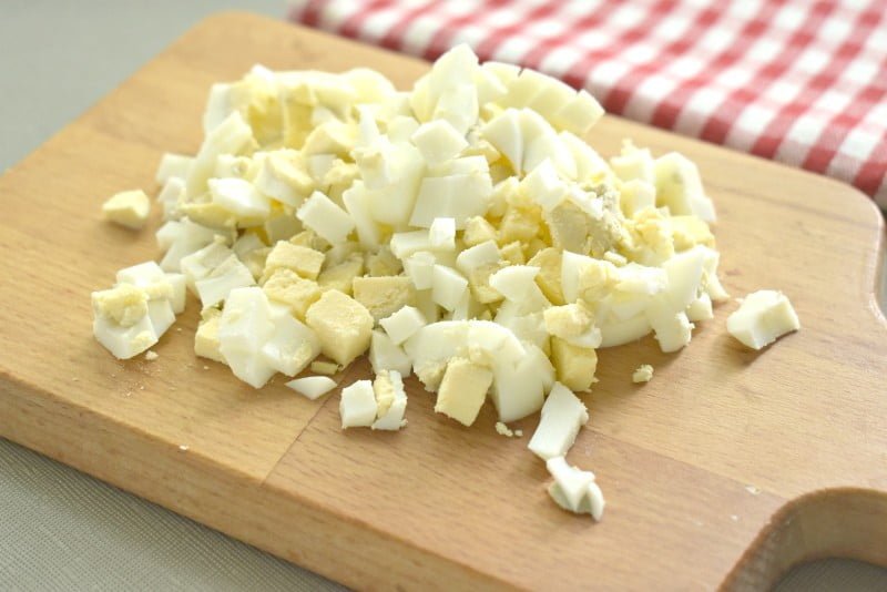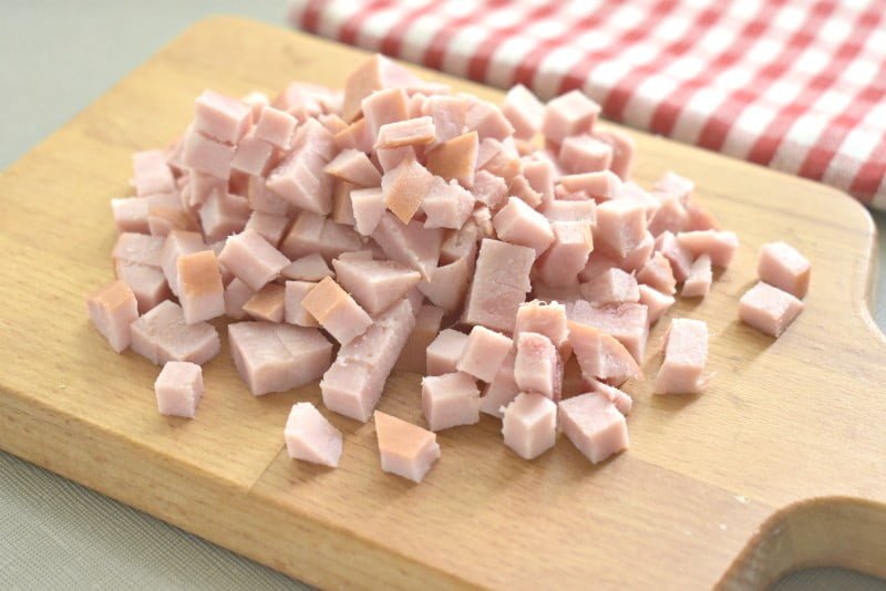 Ветчину любимого сорта нарезаем маленькими кубиками. Аналогично поступаем и с сыром твёрдых сортов.