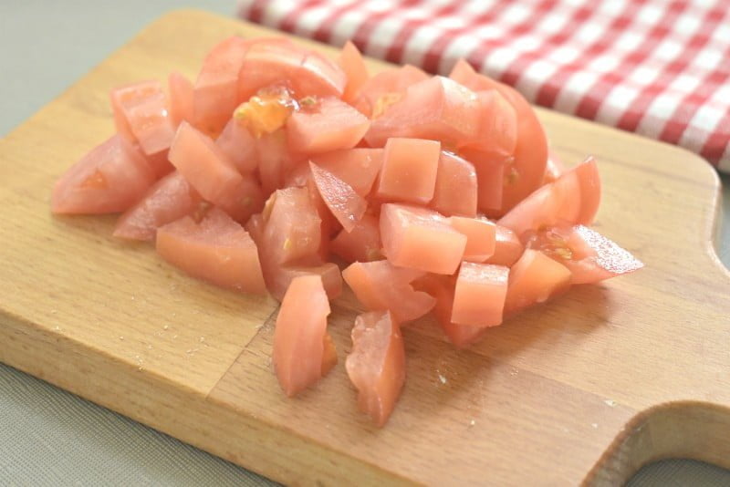 Промываем хорошо помидор, срезаем место, в котором находилась плодоножка и измельчаем плод тоже кубиками.