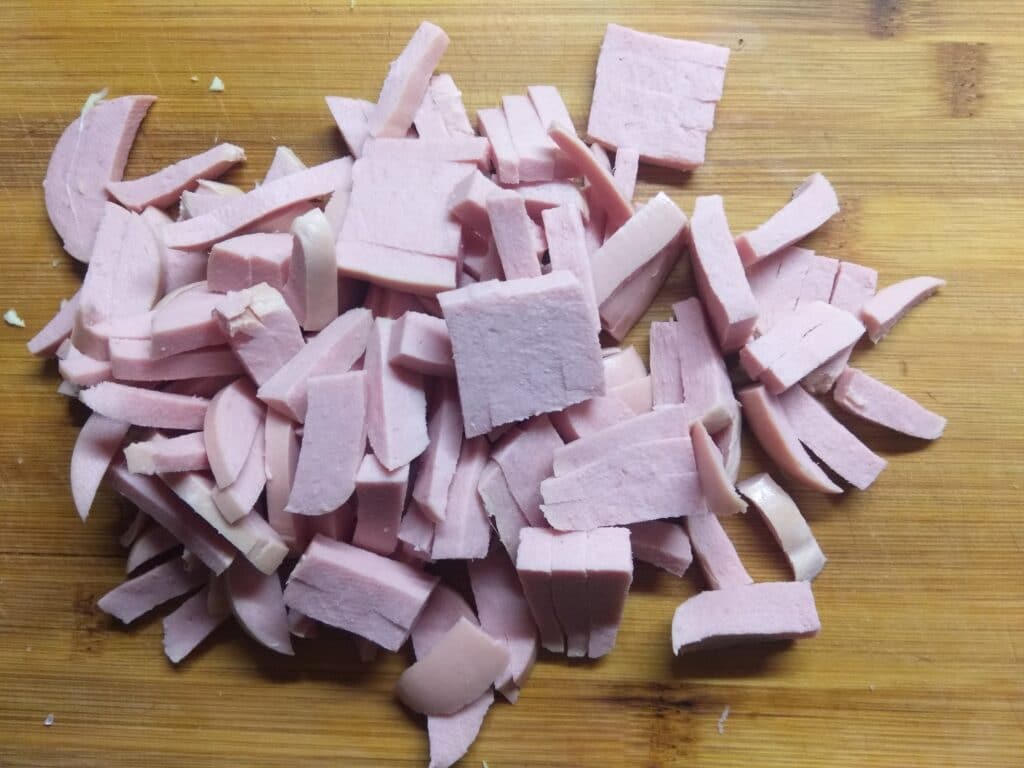 - Колбасу нарезать соломкой. Добавить к остальным ингредиентам.