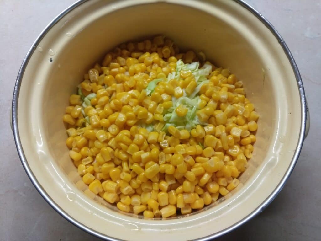 - Переложить капусту с огурцами в кастрюлю. С кукурузы слить жидкость и добавить в кастрюлю.