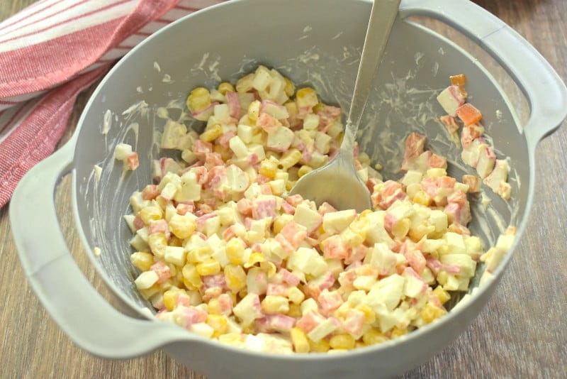 Подготовленные ингредиенты – кукурузу, крабовые палочки, яйца, морковку – соединяем в миске и заправляем любимым майонезом. По вкусу салам солим и перчим. Перемешиваем.