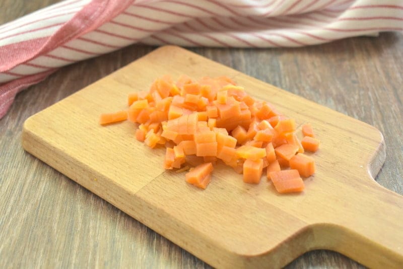 Отварную морковку тоже измельчаем для нашего салата кубиками.