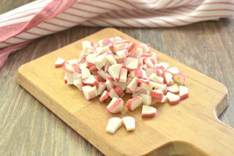 Крабовые палочки нарезаем кубиками.