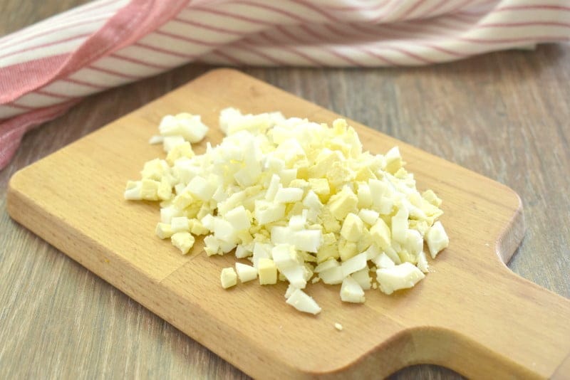 Отварные куриные яйца шинкуем небольшими кусочками.