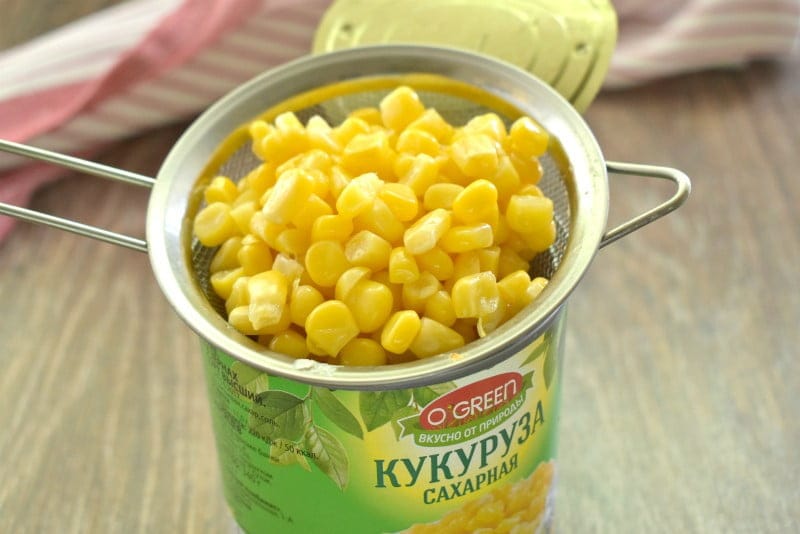 Открываем баночку сладкой консервированной кукурузы. Нужную часть кукурузы откидываем на сито, чтобы слить жидкость.