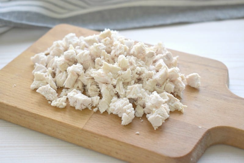 Заранее для нашего салата нужно отварить куриное филе (время на варку примерно 30 минут после закипания воды), картошку (20-25 минут), морковку (25-30 минут), а также яйца (11-12 минут). Когда все ингредиенты будут подготовлены, можно приступать к нарезке. Итак, отварную курицу нарезаем небольшими кусочками, складываем их в миску.