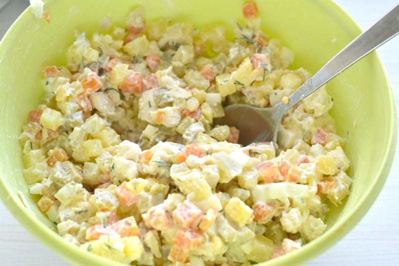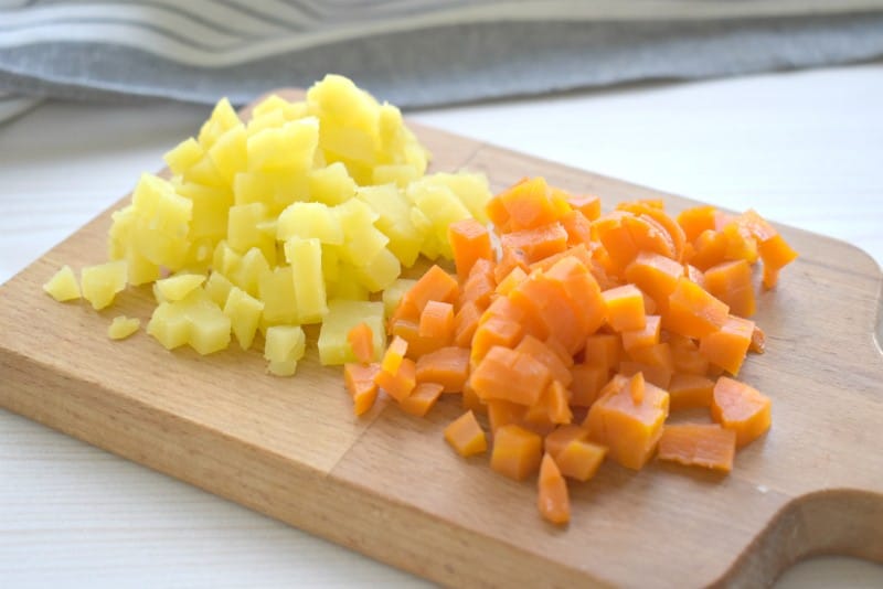 Отварной картофель и морковку нарезаем кубиками.