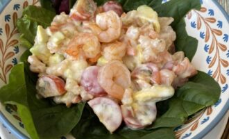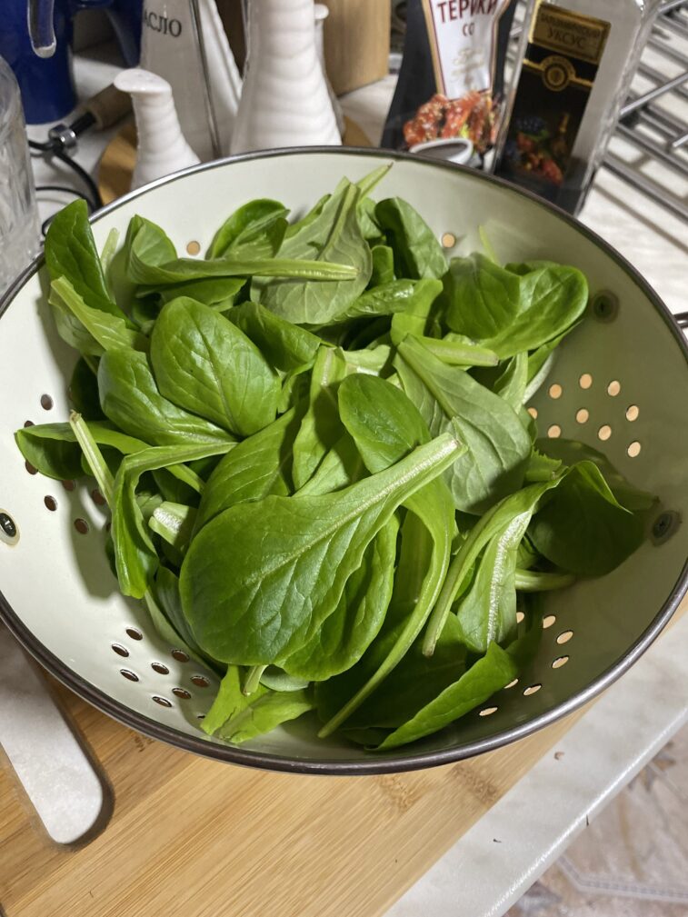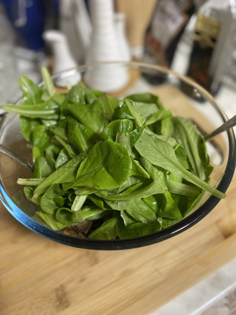 7. После, добавляем листья салата, аккуратно перемешиваем, листья романо нежнее обычного салата, либо шпината, важно, их не мешать интенсивно.