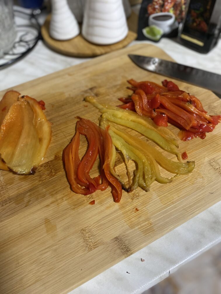 4. Перцы болгарские запечем и очистим от шкурок, чтобы легче было удалить шкурку, можно запеченные перцы на несколько минут положить их в полиэтиленовый пакет, шкурка потом снимется быстро.