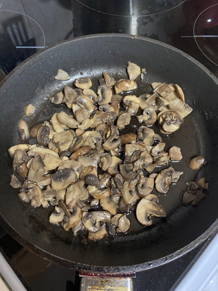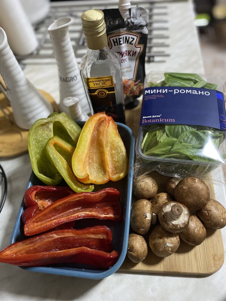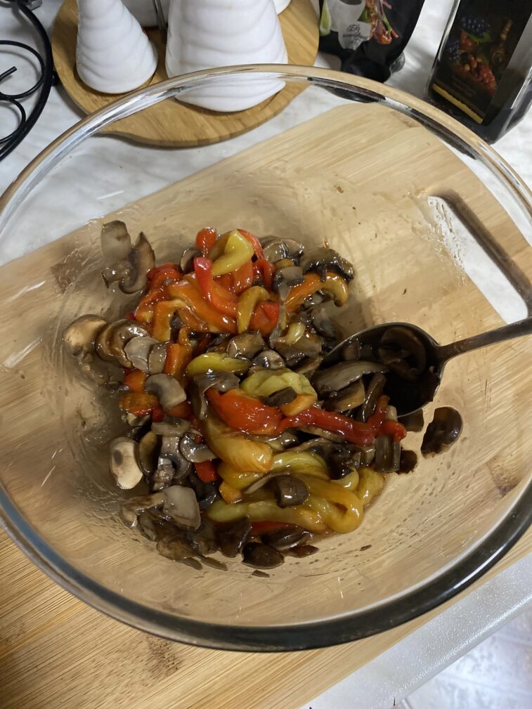 6. Перец и грибы выкладываем в форму для салата, добавим соль, соус терияки и уксус бальзамический, перемешиваем.