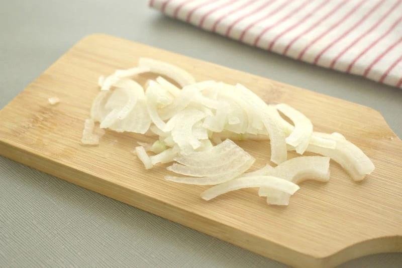 - Очищаем репчатый лук, шинкуем его полукольцами или четверть кольцами, переправляем в состав салата.