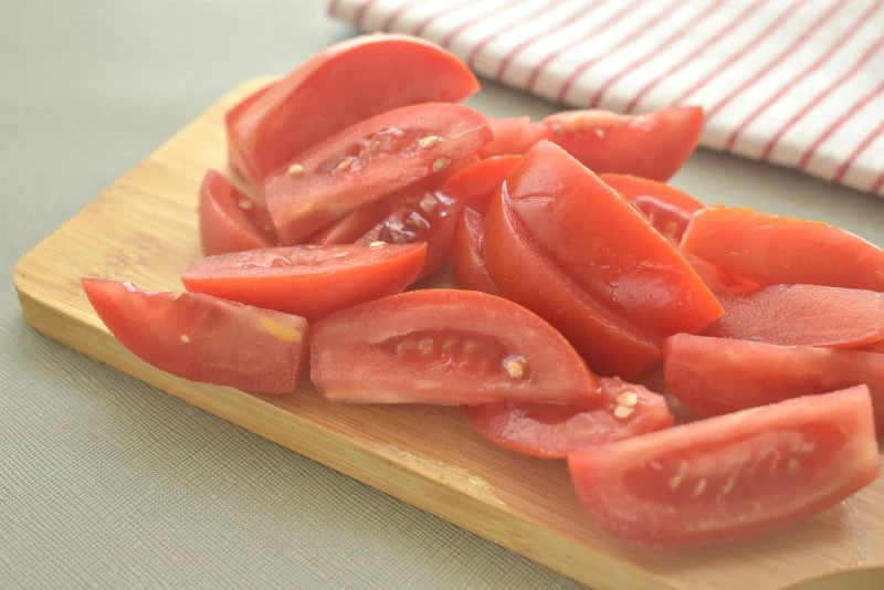 - Помидор для блюда нарезаем небольшими ломтиками.