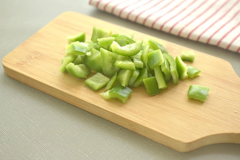- Очищаем сладкий болгарский перец от семян и ополаскиваем. Измельчаем перец кубиками.