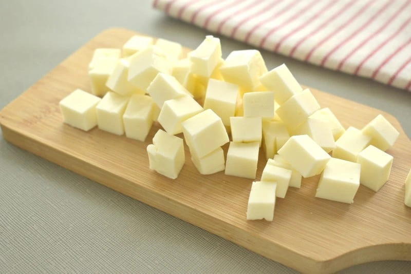 - Плавленый сыр для нашего салата нарезаем маленькими кубиками и перекладываем их миску.