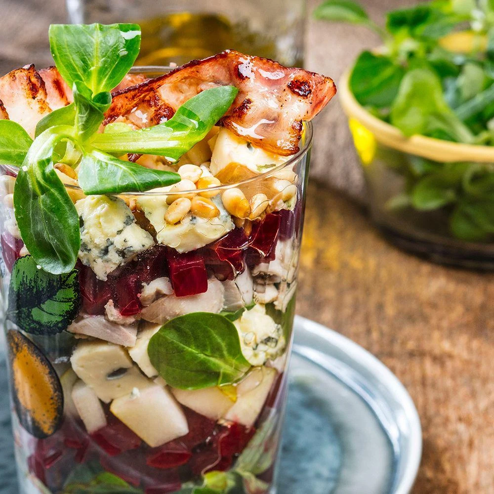 Вместо утки можно взять индейку или гуся. Из салатов любой микс-салат без ярко выраженного вкуса. Идеальны сорта корн, айсберг, мангольд. Сыр подойдет и с голубой плесенью, и с красной – главное, чтобы он хорошо крошился. С белой – слишком тягучий и поэтому не годится. Растительное масло: лучше использовать смесь оливкового и подсолнечного в пропорции 1:2 или же масло грецкого ореха. Этот салат отлично смотрится при порционной подаче: складывайте его слоями, верхний слой – сыр, бекон и орешки.