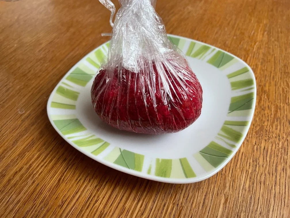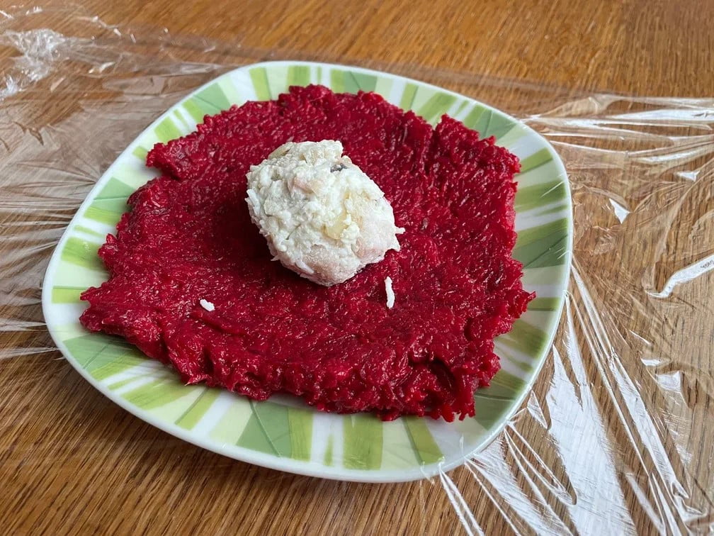 Перед подачей закуски «Селедка под шубой» удалите пищевую плёнку и украсьте блюдо майонезом в виде «ёлочных шаров». Для этого отрежьте уголок у дой-пакета и выдавите майонез.