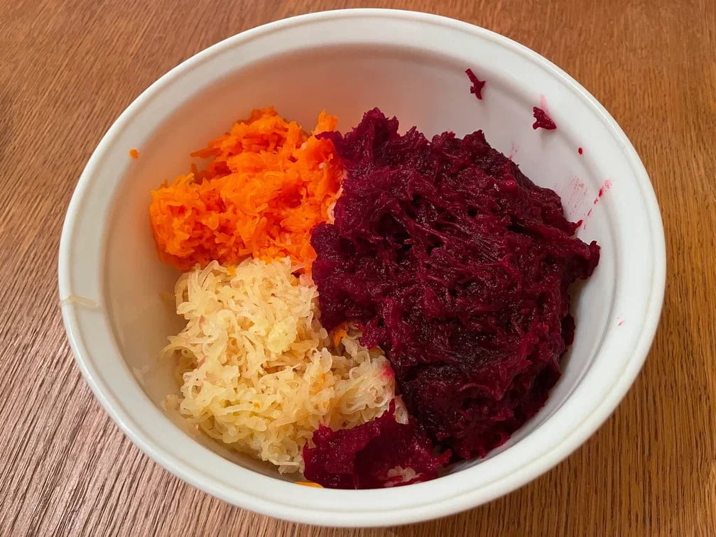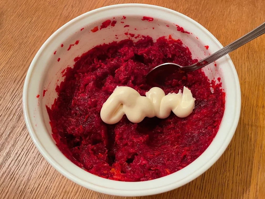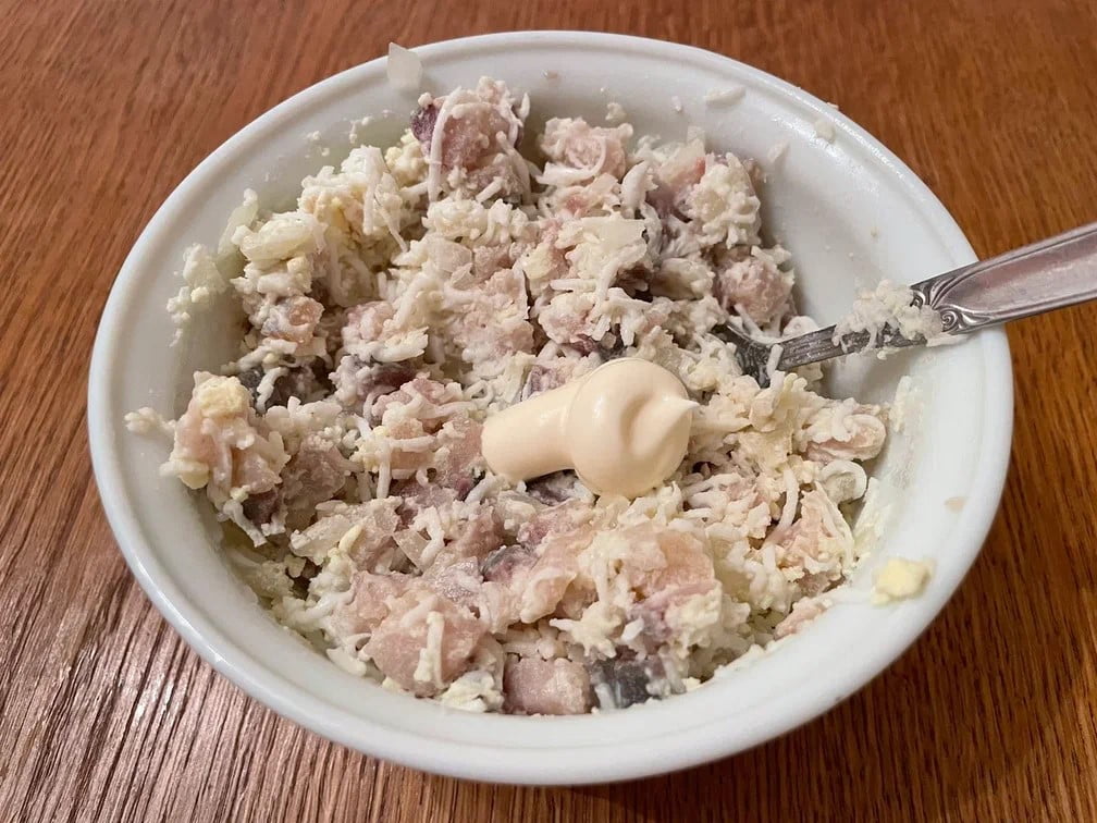 Очистить оставшиеся вареные овощи и натереть их на мелкой тёрке. Заправить небольшим количеством майонеза и хорошо перемешать. Теперь можно приступать к формированию шариков.