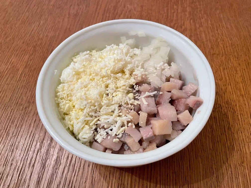 Яйца, сваренные вкрутую, очистить и натереть на тёрке. Репчатый лук также очистить и мелко нарезать. Сложить овощи в миску и залить крутым кипятком, оставить на пять минут. Затем воду слить. Филе сельди нарезать мелкими кубиками, удалив все косточки, если они есть.