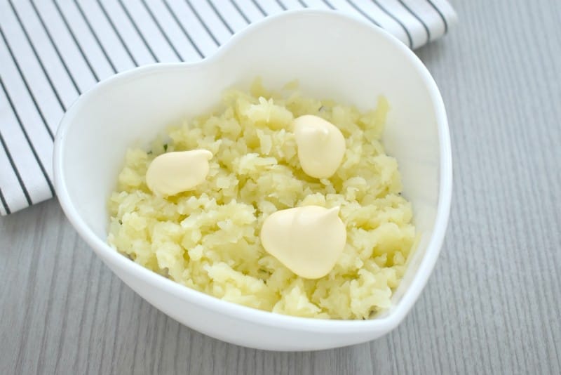 Отварной картофель крупно натираем, формируем следующий слой, наносим на него майонез.