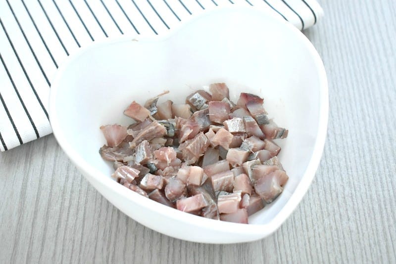 Чтобы приготовить слоёный салат Селёдка под шубой с зелёным луком, предварительно нужно отварить свёклу, морковь и картошку, время варки корнеплодов займёт примерно 30-35 минут. После варки эти ингредиенты остудить под ледяной водой и очистить. Первым слоем нашего салата будет селёдка, нарезанная кубиками.