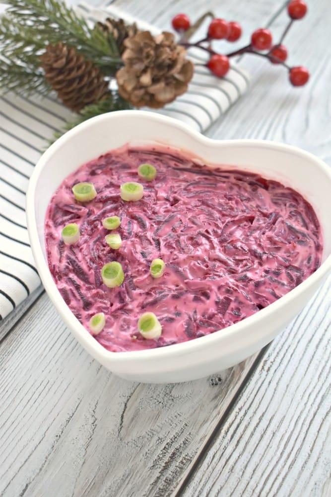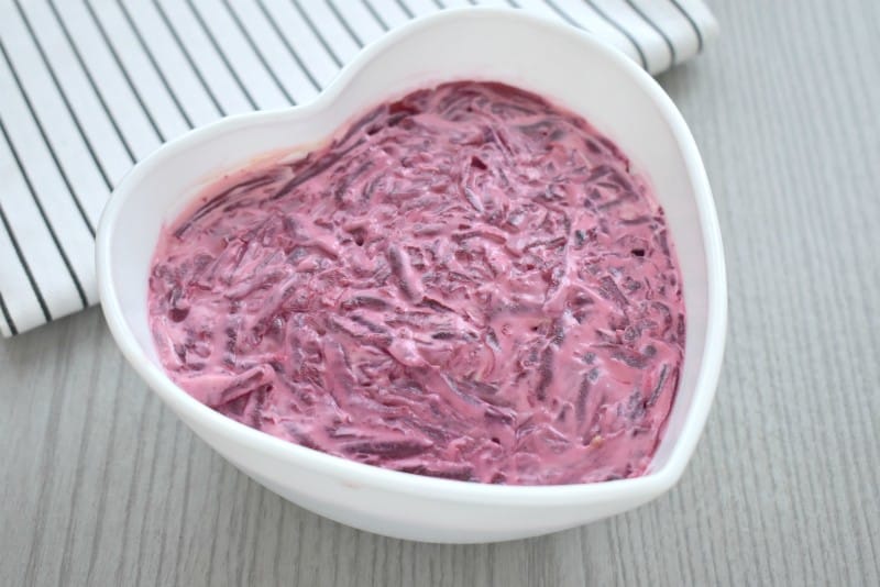 По традиции сборку салата Селёдка под шубой завершаем натёртой свёклой. Покрываем слой майонезом. Отправляем салат в холодильник, чтобы слои достаточно пропитались.