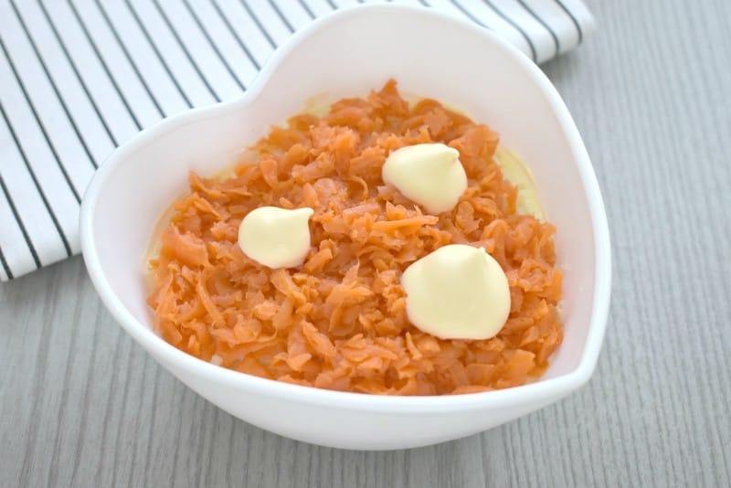 Теперь следует слой из натёртой моркови. Этот слой тоже смазывай майонезом.