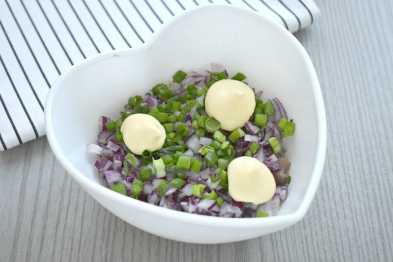 На слой из рыбы помещаем измельчённый фиолетовый лук, а сверху добавляем зелёный лук, нарезанный колечками. Луковый слой покрываем майонезом.