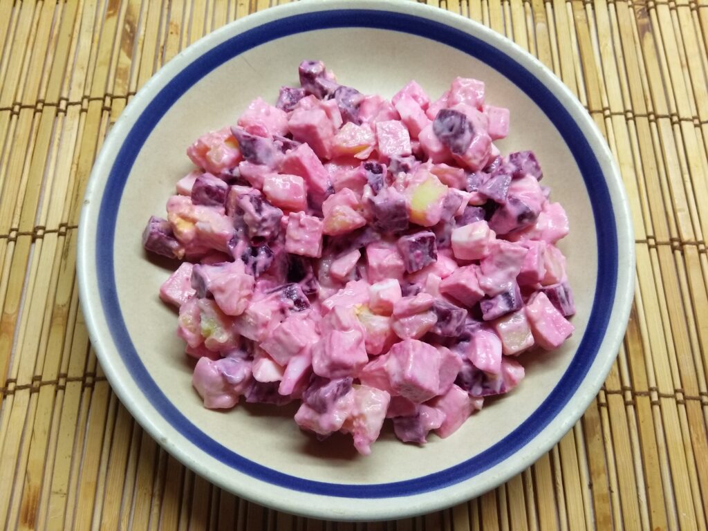 Бюджетный, но при этом вкусный, сытный и яркий салат из простых ингредиентов – свеклы, картофеля и докторской колбасы.