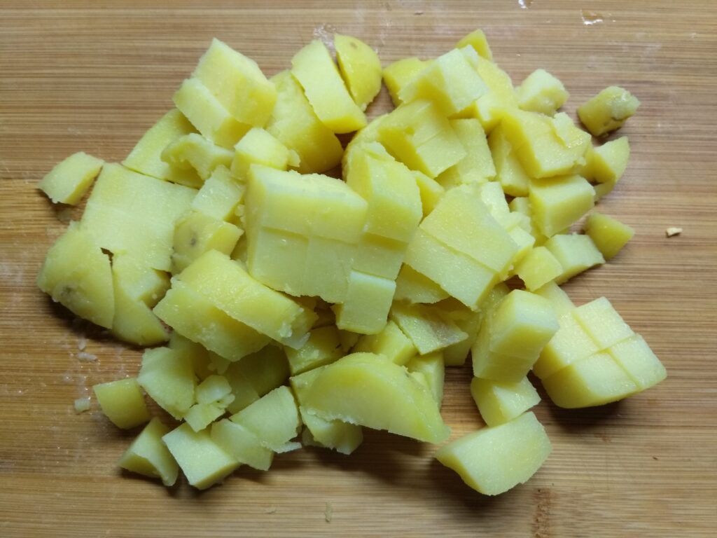 - Картофель помыть, отварить до готовности. Остудить, очистить. Картофель нарезать кубиками.