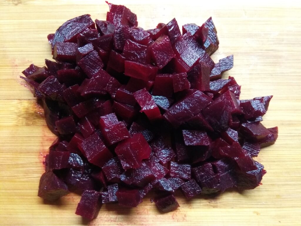 - Свеклу помыть, отварить до готовности. Остудить, очистить. Свеклу нарезать кубиками.