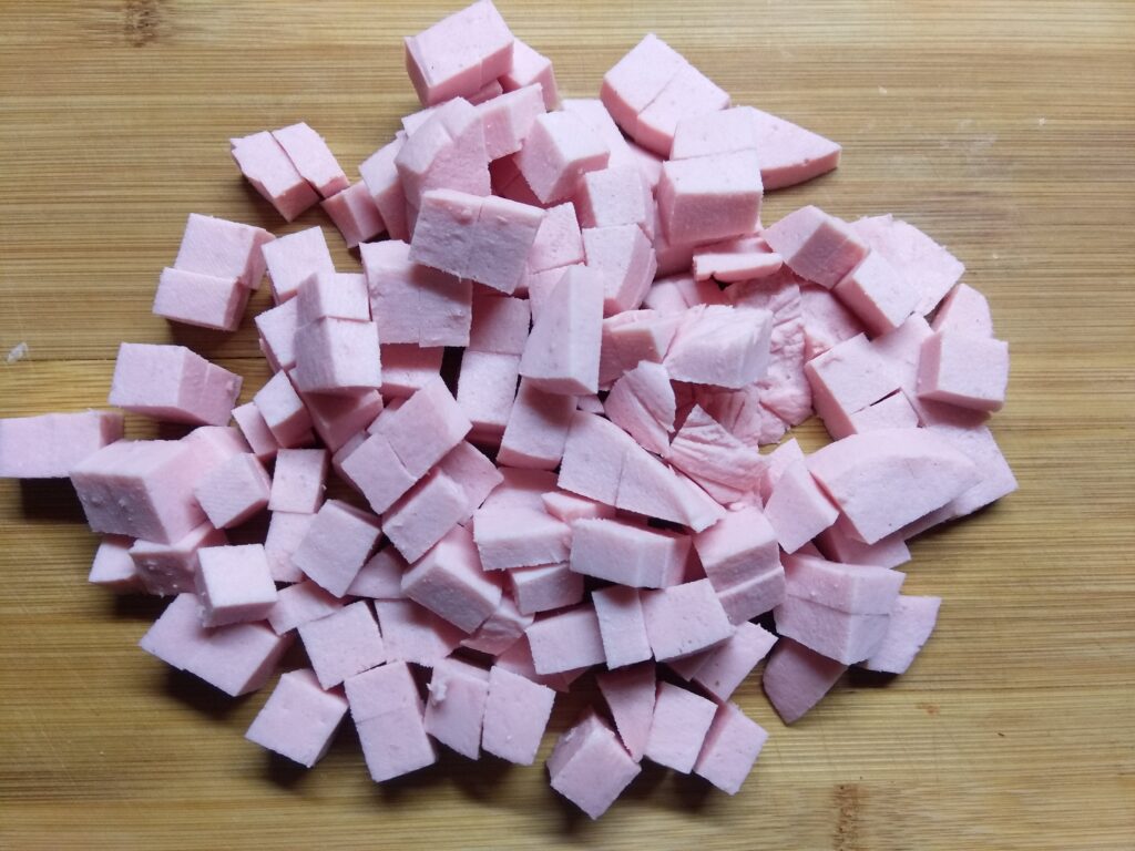- Колбасу нарезать кубиками.