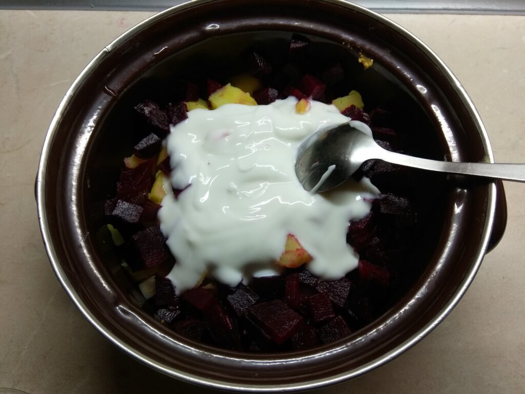 - Сложить все ингредиенты в кастрюлю и заправить йогуртом.