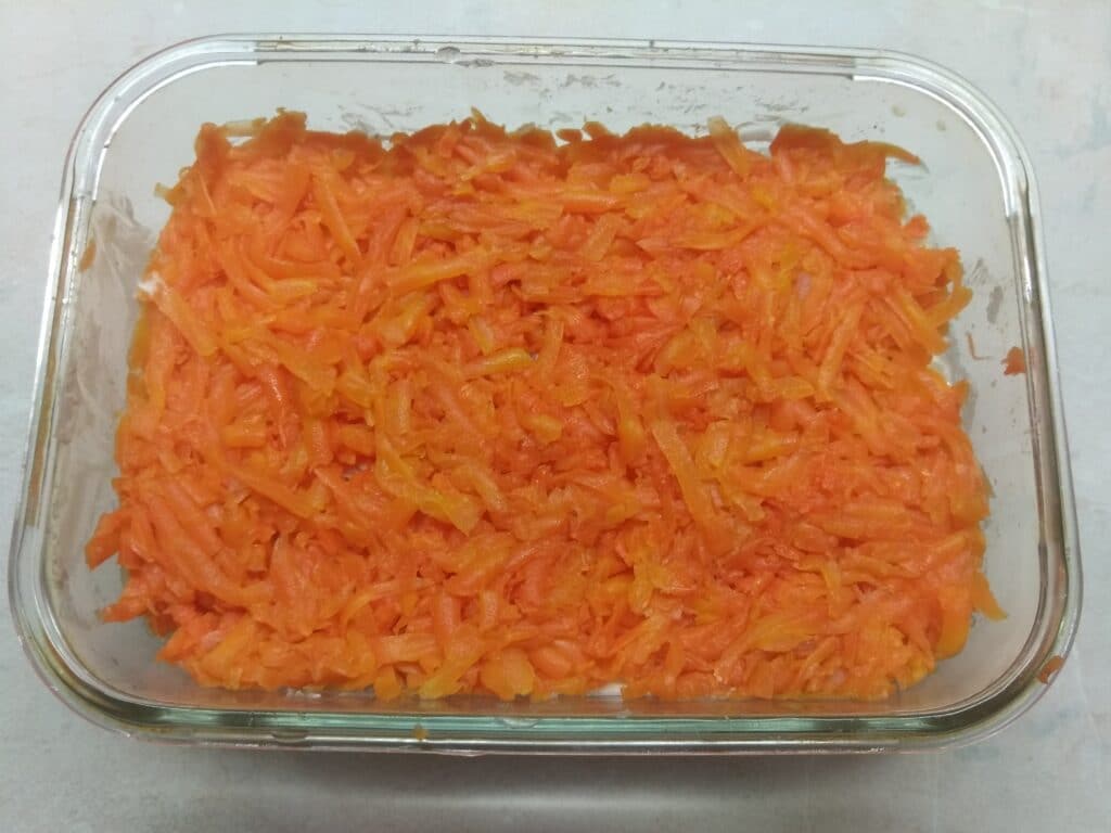 | 5 | 5. На слой картофеля натереть слой моркови, предварительно очистив от кожуры. Снова смазать. |