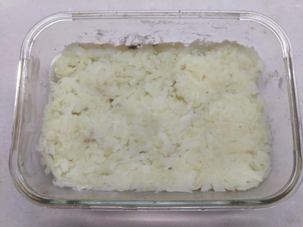 | 4 | 4. Затем очистить и натереть картофель. Снова смазать слой сметаной. |