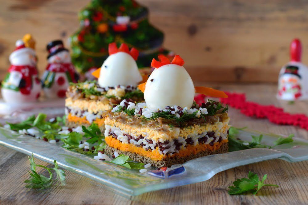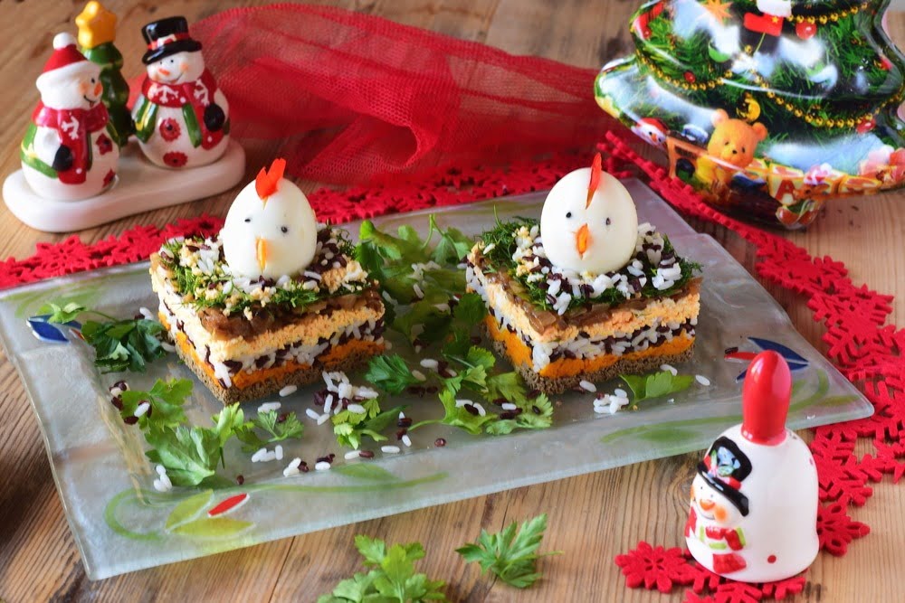 | 7 | Петушок: делают его из вареного яйца. Желток вынимают и добавляют в салат, а из двух половинок белка делают петушка. Если белок не разрезать до конца, желток вытащить из надреза сбоку, тогда не потребуется склеивать половинки майонезом. Глазки из черного риса, клюв из моркови, гребешок из моркови. Все втыкать (предварительно проткнув нужное место ножом). |
