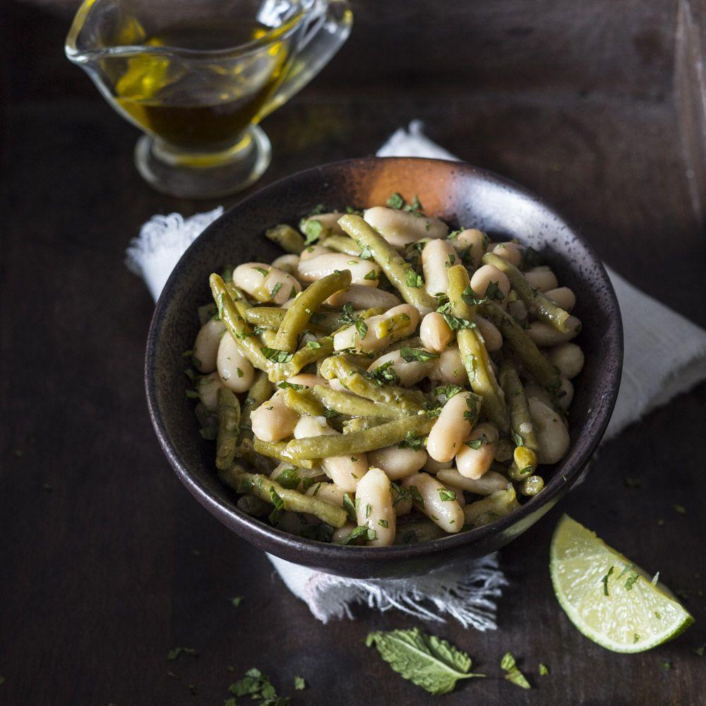- Смешайте в миске зеленую фасоль, белую фасоль, мелко нарубленную мяту, сок лайма, оливковое масло.