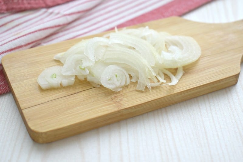 Очищаем репчатый лук, шинкуем его тонкими полосками.