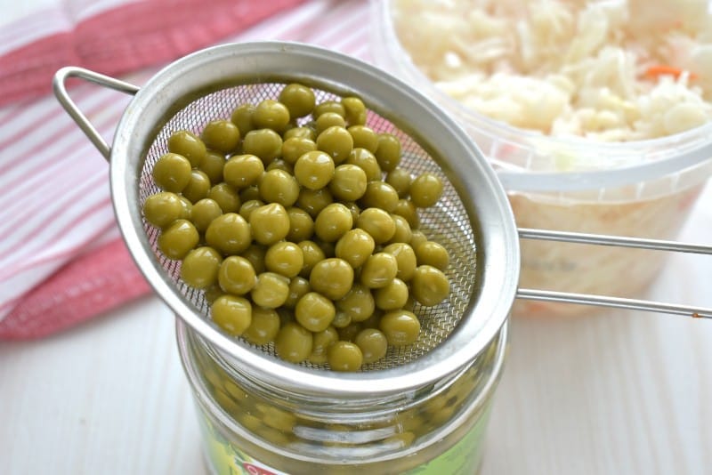 Горошек откидываем на сито, а капусту по необходимости промываем.