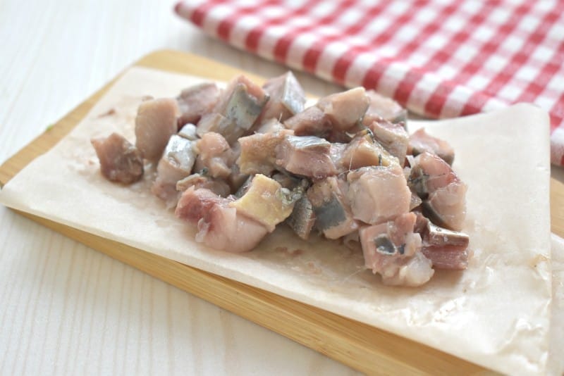 Филе соленой сельди нарезаем маленькими кусочками.