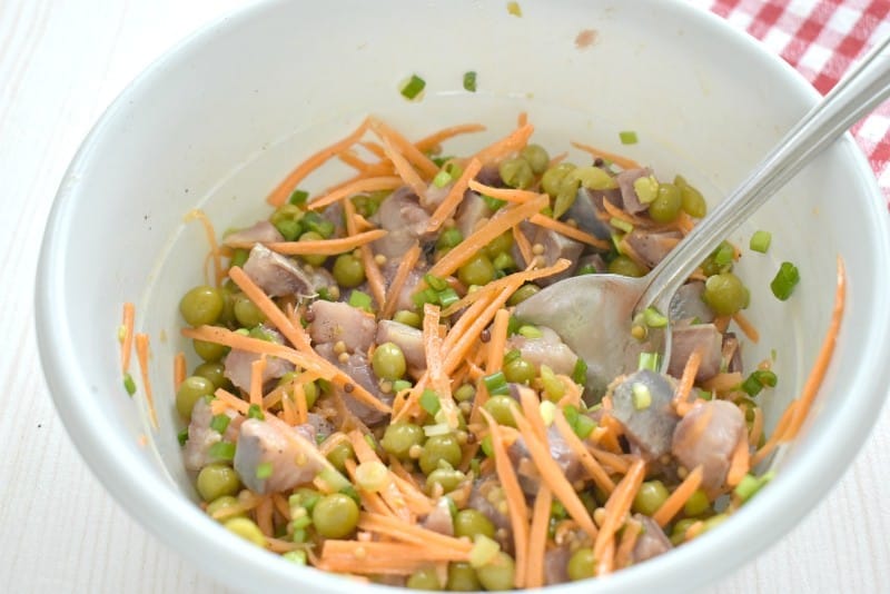 Подготовленные ингредиенты – горошек, селедку, морковку, зеленый лук – соединяем в миске и заправляем растительным маслом. Также по желанию можно добавить горчицу в зернах. Закуску можно слегка поперчить.