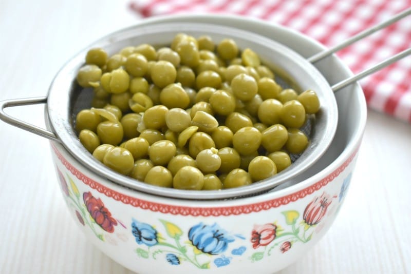 Открываем баночку консервированного зеленого горошка. Откидываем горошек на сито, чтоб слить с продукта жидкость.