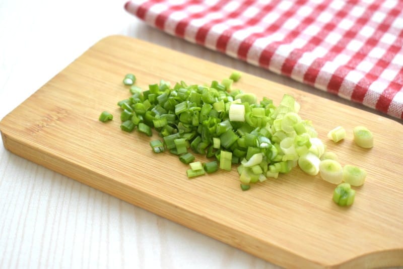 Ополаскиваем под прохладной водой перья зеленого лука. Нарезаем зеленый лук тонкими колечками.