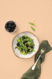 - В глубокой миске смешайте рукколу с нутом, добавьте лук порей и маслины.