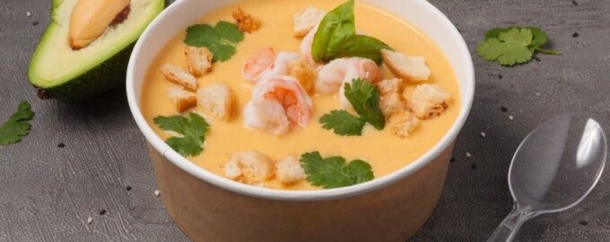 Ингредиенты 200 г. Креветки 150 г. Твёрдый сыр 2 ст. л. Мука 200 г. Сливки 10% 1 шт. Лук 500 г. Бульон овощной по вкусу Перец 1 ст....