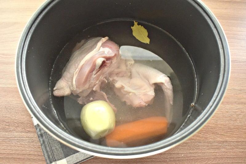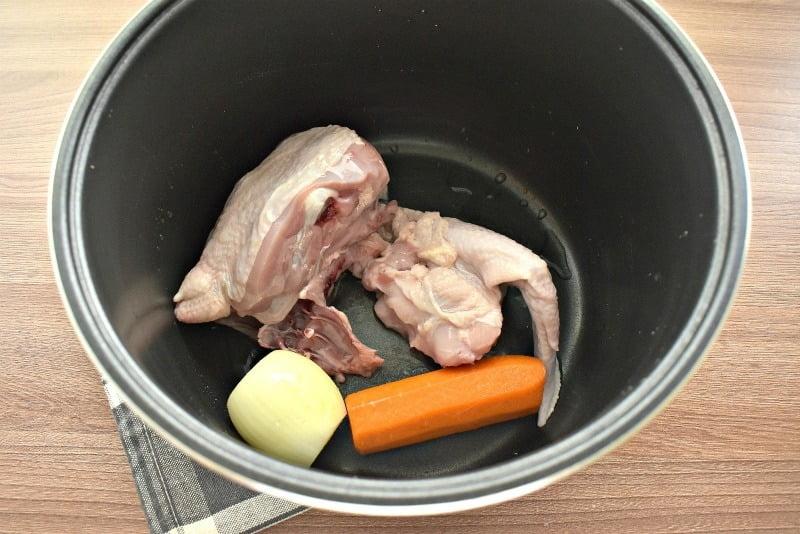 В съемную чашу мультиварки выкладываем подготовленное куриное мясо, морковку и лук целиком. |
