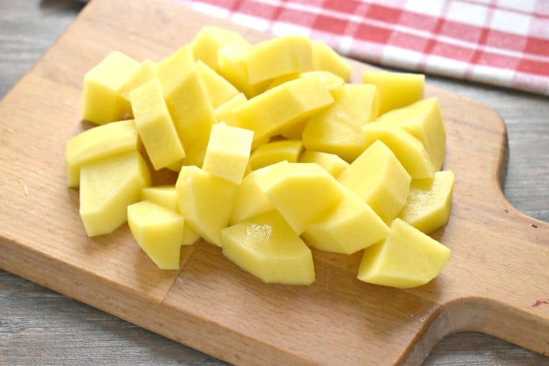 Для приготовления щей можно использовать бульон из любого вида мяса от курицы до говядины. Но если вы поститесь, мясной бульон можно заменить на овощной. У нас бульон уже готов, поэтому приступаем к подготовке остальных ингредиентов. Очищаем картофель, нарезаем средним кубиком и перекладываем в кипящий бульон.