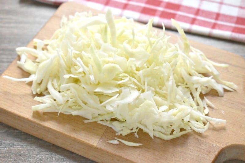 Свежую белокочанную капусту шинкуем тонкими полосками и выкладываем в бульон вслед за картошкой. После того как содержимое в кастрюле закипит, варим картошку с капустой 20 минут.